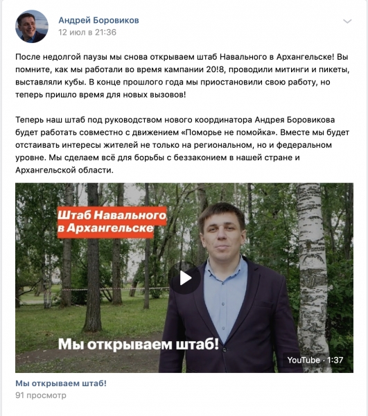 О новом назначении и открытии очередного штаба «навальнист» сообщил своим подписчикам в социальной сети «ВКонтакте». В своей публикации он ратовал за помощь народу не только в рамках региона, но даже и на федеральном уровне.