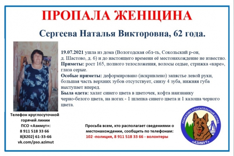 О пенсионерке нет вестей с 19 июля. Тогда 62-летняя Наталья Сергеева из деревни Шастово ушла в неизвестном направлении. До сих пор нет сведений о местонахождении пропавшей. Волонтеры подключились к поискам.