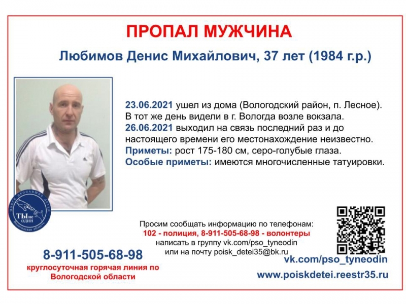 37-летний Денис Любимов 23 июня ушел из дома в поселке Лесное Вологодского района. В тот же день видели в областной столице в районе вокзала. 26 июля выходил на связь, с тех пор местонахождение неизвестно.