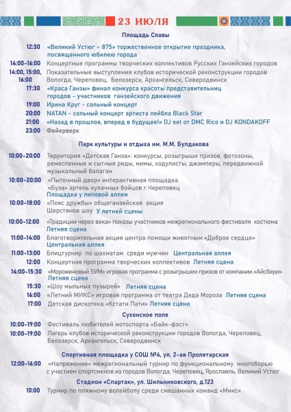В рамках празднования Дня города вечером на площади Славы выступят Ирина Круг, исполнитель Natan, диджеи. Завершит программу красочный фейерверк. Кроме того, площадками празднования станут парк культуры и отдыха имени Булдакова, Сухонское поле, спортплощадка у школы №4 и стадион «Спартак».