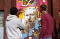 Рисунок украсил фасад выставочного зала на улице Юбилейной. Росписью занимались московские художники, представляющие творческое объединение COLORTOWN. 18-метровый портрет в стиле паблик-арт выполнили в технике коллажа, пишет cherinfo.ru.