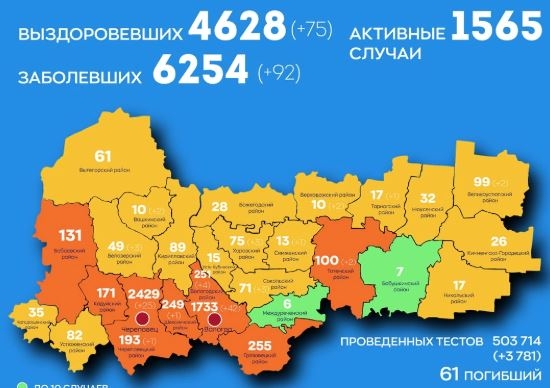 По-прежнему ковид находят и во многих районах. В Вологодском 4 новых заразившихся, в Белозерском и Сокольском районах - по 3, в Вашкинском, Великоустюгском, Верховажском и Тотемском - по 2, в Череповецком, Шекснинском, Тарногском и Сямженском районах - по 1.