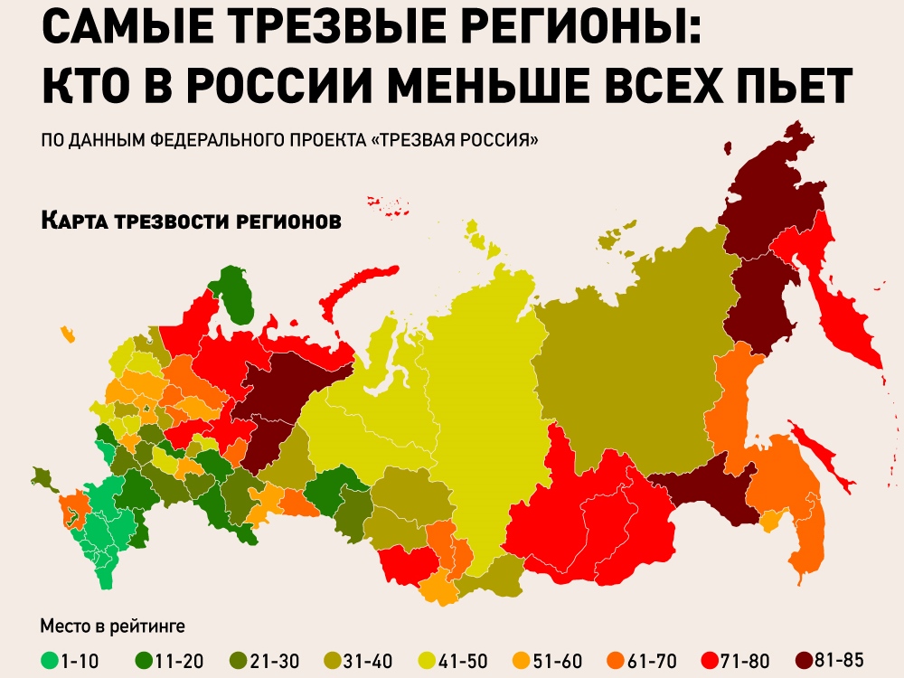 В итоге самыми малопьющими субъектами РФ стали северокавказские республики, а также Калмыкия, Ставрополье, Ростовская и Белгородская области, сообщает ИА «СеверИнформ» со ссылкой на «Известия». Больше же всех проблем с алкоголем испытывают Магаданская область, Чукотский АО и республика Коми.
