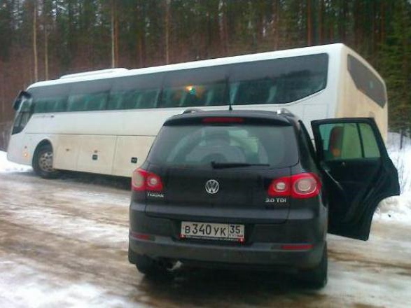 Вскоре в стоящий на дороге автобус врезался автомобиль «Volkswagen Tiguan» с вологодскими номерами. При этом 70-летняя пассажирка этой машины получила небольшую травму. Затем во внедорожник въехал «Chevrolet Lanos», обошлось без пострадавших.