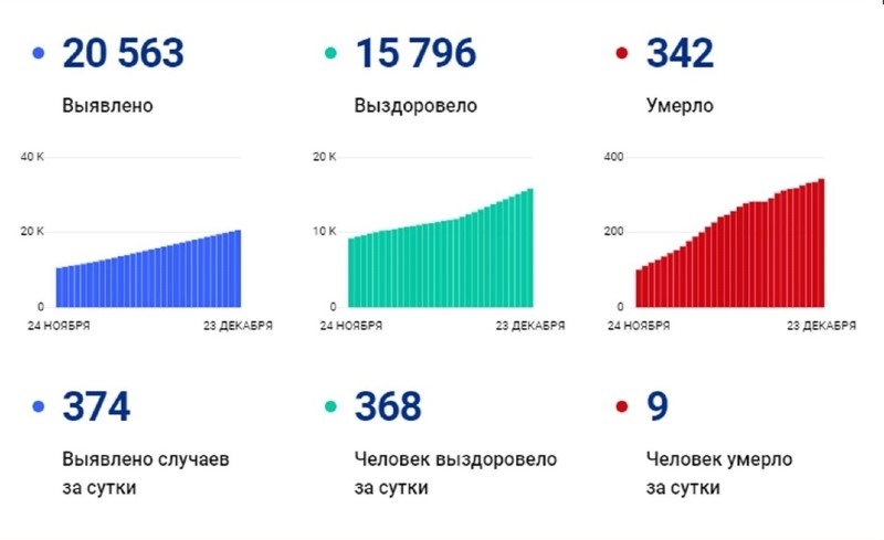 Новая статистика на утро 23 декабря появилась на сайте стопкоронавирус.рф. Итак, в Вологодской области с начала пандемии заболело 20 563 человек, смогли побороть болезнь - 15 796. Официально зарегистрировано 342 смерти. За прошедшие сутки - 9.