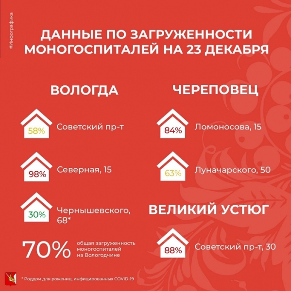 В Череповце ситуация сложнее . Но и там в основном моногоспитале на улице Ломоносова есть свободные места, правда, они составляют только 16% от коечного фонда. На ул. Луночарского, в моногоспитале на базе роддома, заполнено на 63% мест.