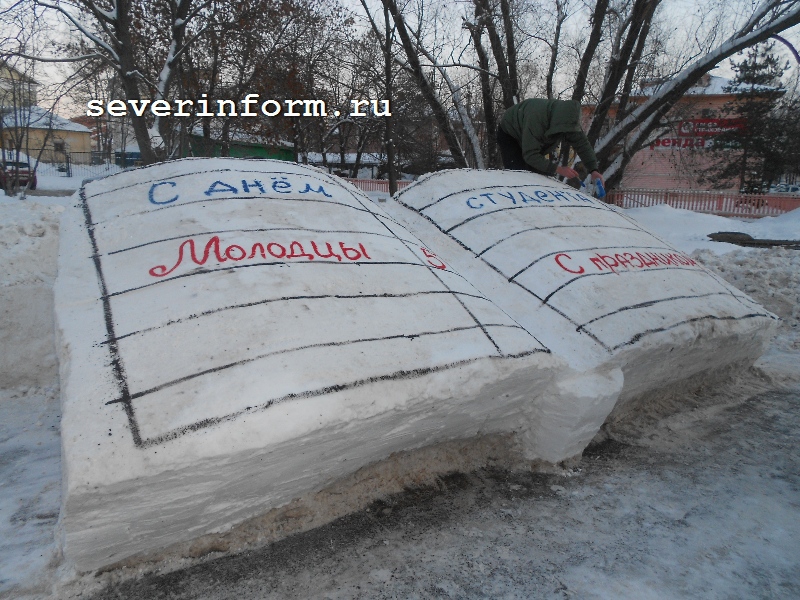 Снежная скульптура зачетной книжки появилась в Вологде. Ее за два часа соорудили студенты нескольких вузов в Вологде. Таким образом молодежь решила поздравить всех студентов с их праздником и Татьяниным днем, сообщает ИА «СеверИнформ — Новости Вологды».
