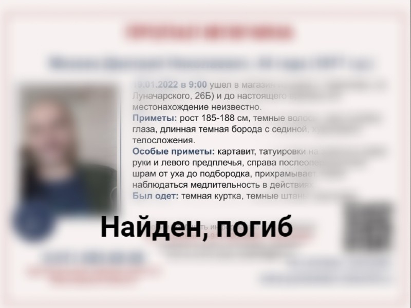 Родные начали волноваться и обратились в поисковый отряд «Ты не один». 23 января мужчина был найден мертвым. Подробности обнародовал Следственный Комитет.