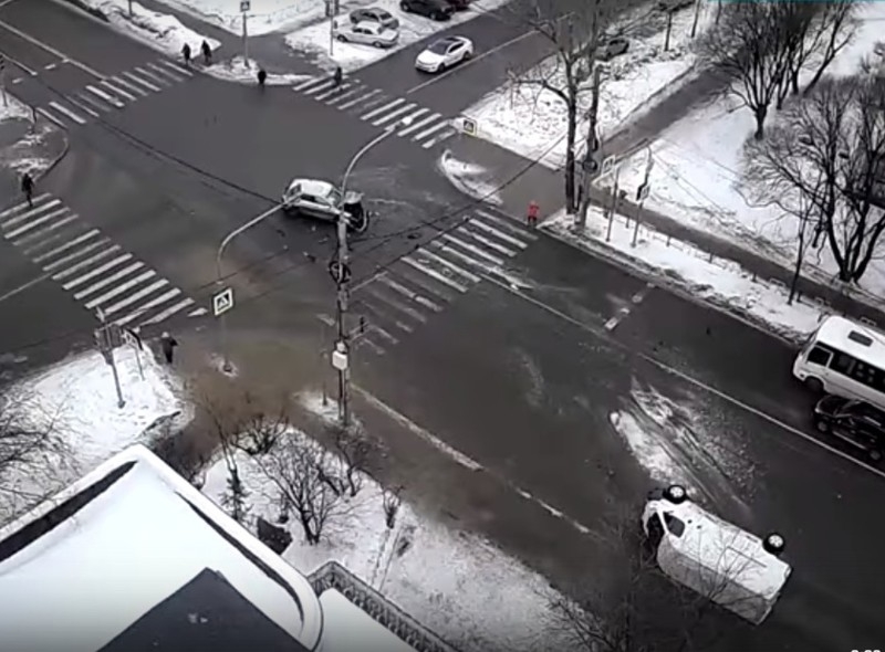 ДТП произошло в районе полудня на пустом перекрестке. Удар был такой силы, что легковой автомобиль развернуло на дороге, а вторая машина легла на бок и проехала в таком положении несколько метров.