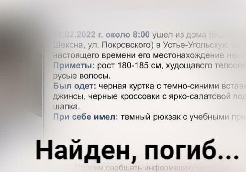 Руслан вышел из дома в школу, и больше его никто не видел. Сначала искали по знакомым, в заброшенных районах поселка. Потом появилась запись видеокамеры, на которой видно, как подросток идет к федеральной трассе. Затем поступила информация, что очень похожий мальчик прыгнул с моста в Шексну.