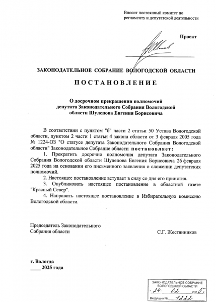 На сайте Законодательного собрания Вологодской области опубликован проект постановления за входящим № 1222 от 24.02.2025 г. о досрочном прекращении полномочий депутата Евгения Борисовича Шулепова.