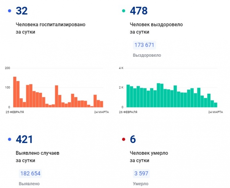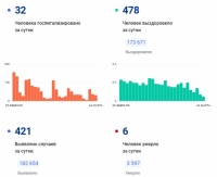 За сутки выявлено 421 новых случаев ковида. Это рекордно низкий показатель с января. Выписали с больничного 478 пациентов.
