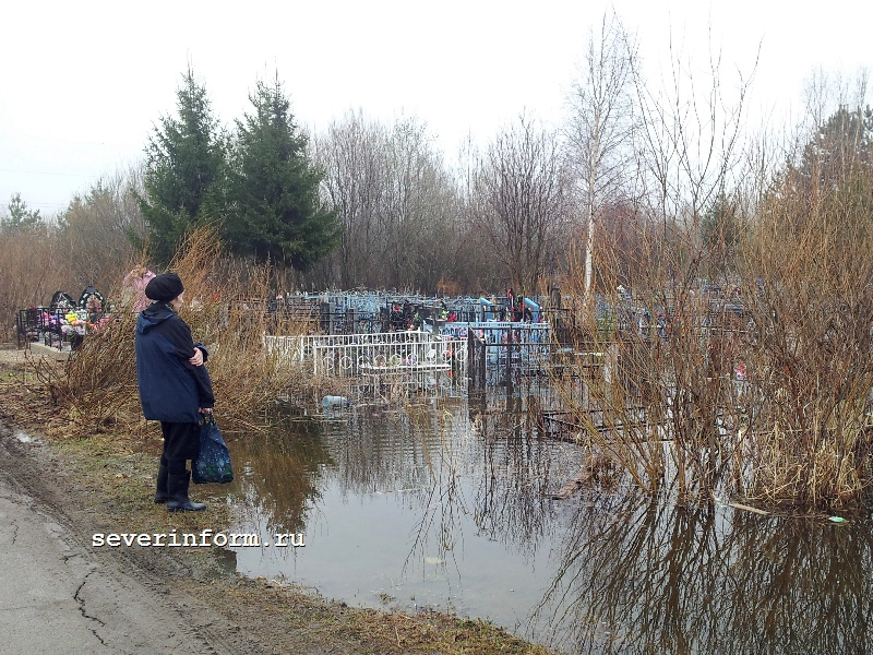 По словам работников, одна из причин подтопления состоит в том, что на кладбище засорился дренаж. В последние дни он не справляется с потоком талых вод.