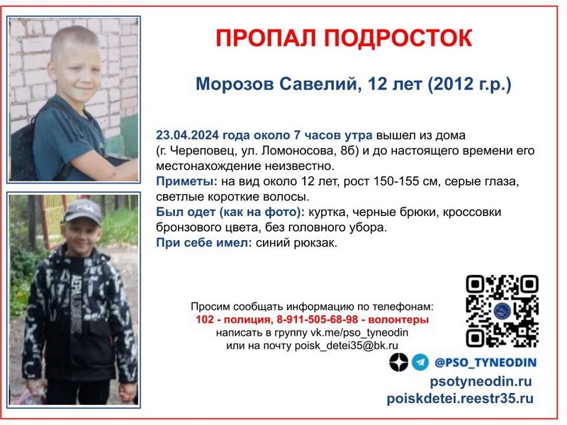 Мальчик был одет в куртку, черные брюки, при себе имел рюкзак. Просьба звонить с любой информацией по телефону 911-505-68-98, сообщает ИА «СеверИнформ».