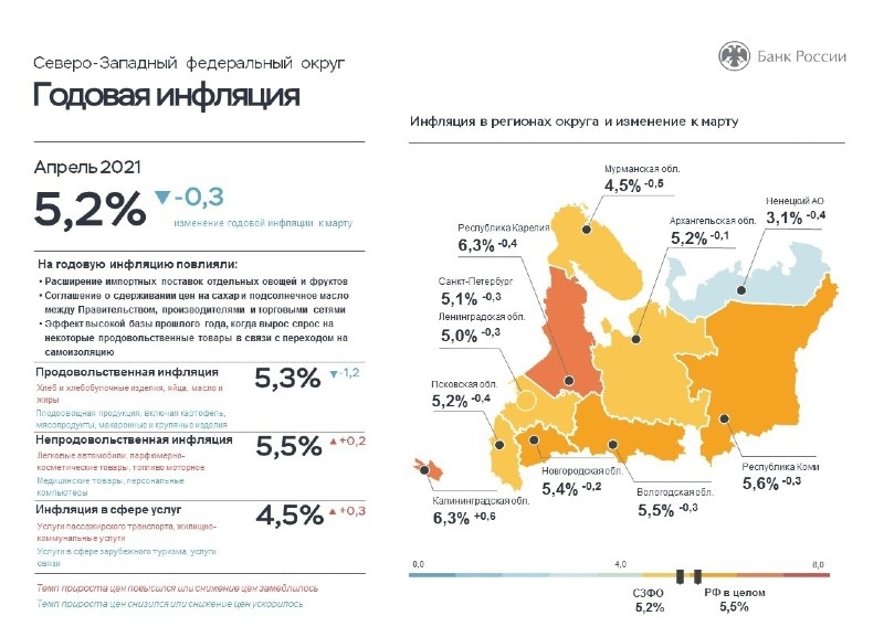 Теперь ее уровень соответствует общероссийскому. Основными причинами замедления инфляции стало сезонное расширение предложений на овощи и фрукты, а также меры Правительства России по стабилизации цен на рынке продовольствия и эффекты высокой базы прошлого года.