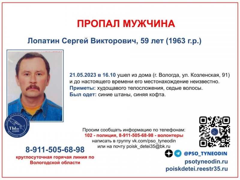 Известно, что мужчина худощавого телосложения, с седыми волосами. В день пропажи был одет в синюю кофту и синие штаны.