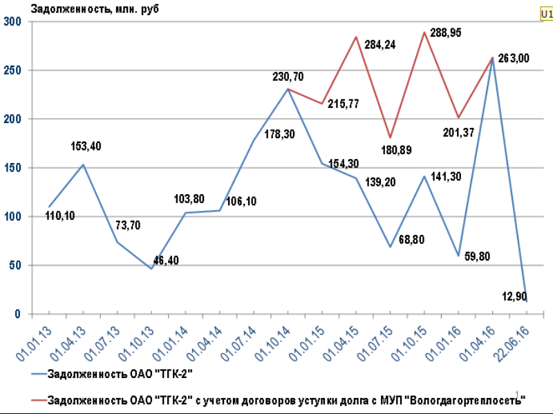 Как видно из представленного графика, начиная с 2013 года ТГК-2 всегда имело задолженность за поставку природного газа. За это время ТГК-2 ни разу не оплачивало топливо авансом (синяя линия). В период с 2014 по 2016 г.г. ООО «Газпром межрегионгаз Вологда» напрямую получало т.н. «тепловые деньги» от Вологдагортеплосети в зачет газового долга ТГК-2. Если бы договоры уступки долга не применялись, задолженность ТГК-2 была бы значительно больше (красная линия).
