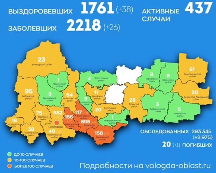 За сутки в регионе прибавилось 26 случаев, из них 18 - в Череповце. Еще 3 человека заразились в Череповецком районе. По одному пациенту добавилось в Вологде, Вологодском, Грязовецком, Кадуйском и Шекснинском районах.