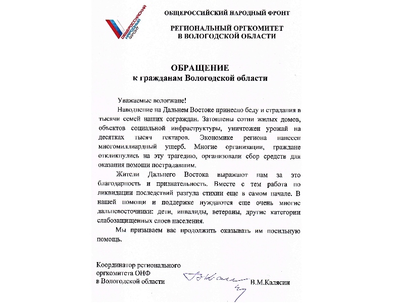 Региональный оргкомитет «Общероссийского народного фронта» призвал жителей Вологодской области помочь пострадавшим от наводнения на Дальнем Востоке. С соответствующим заявлением обратился координатор регионального оргкомитета ОНФ Валерий Калясин.
