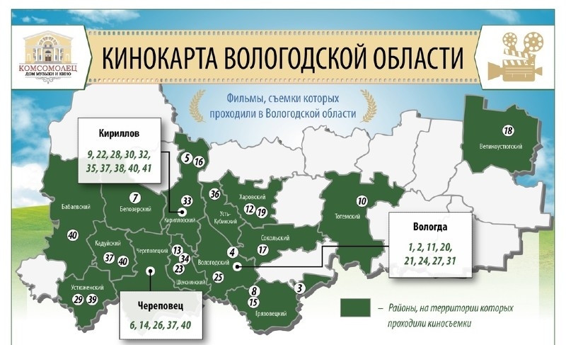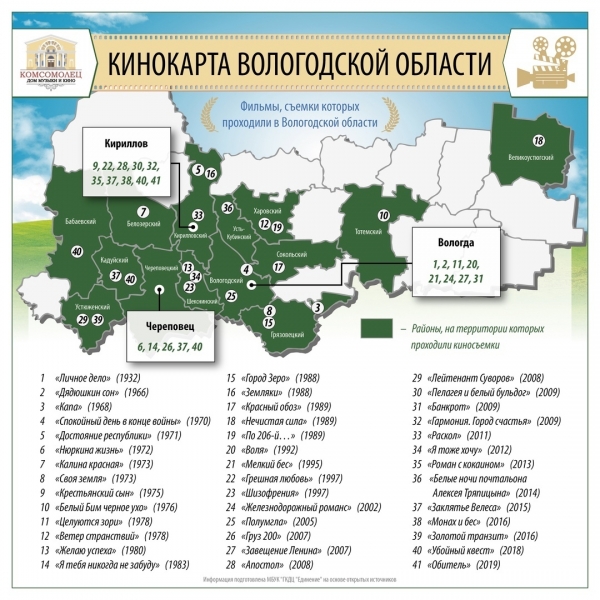 Одними из первых фильмов, снятых в Вологде, стали картины "Личное дело" (1932), и "Дядюшкин сон" (1966). Самыми яркими - "Достояние республики", "Целуются зори", "Калина красная", "Раскол". В Кириллове было снято несколько сериалов, среди них "Апостол" и "Пелагия".