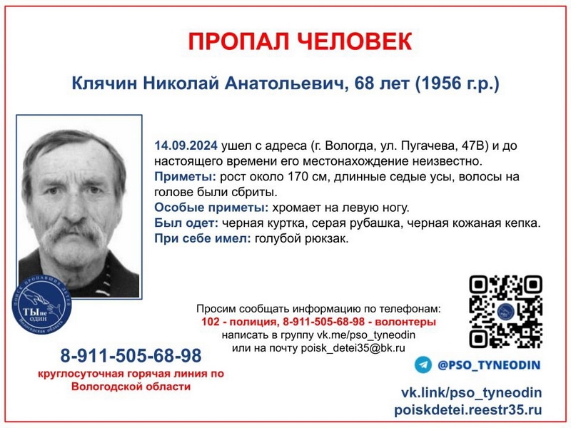 68-летний Николая Клячин живет в Вологде. Мужчина носит длинные усы, при этом лысый. Пропал 14 сентября. Из особых примет: хромает и при себе имеет голубой рюкзак.