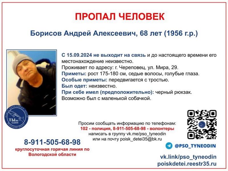 Андрею Борисову из Череповца тоже 68 лет. О его местопребывании ничего не известно с 15 сентября. Из дома он ушел с маленькой собачкой. Седой, передвигается с тростью.