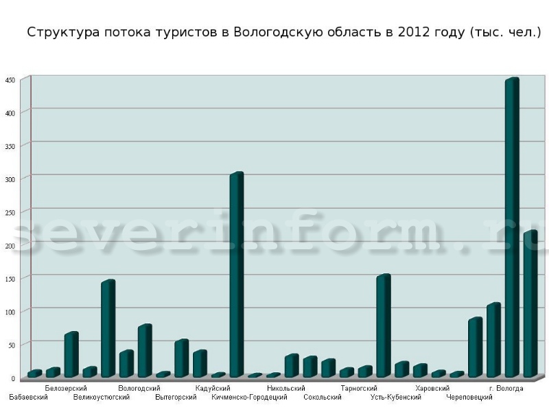 Тройку лидеров замыкает город металлургов — 219,3 тысяч гостей. Интересно, что Великоустюгский район занимает лишь пятое место по туристическому потоку. Аутсайдером среди районов Вологодской области в 2012 году стал Кичменско-Городецкий район. Его посетили лишь четыре тысячи туристов.