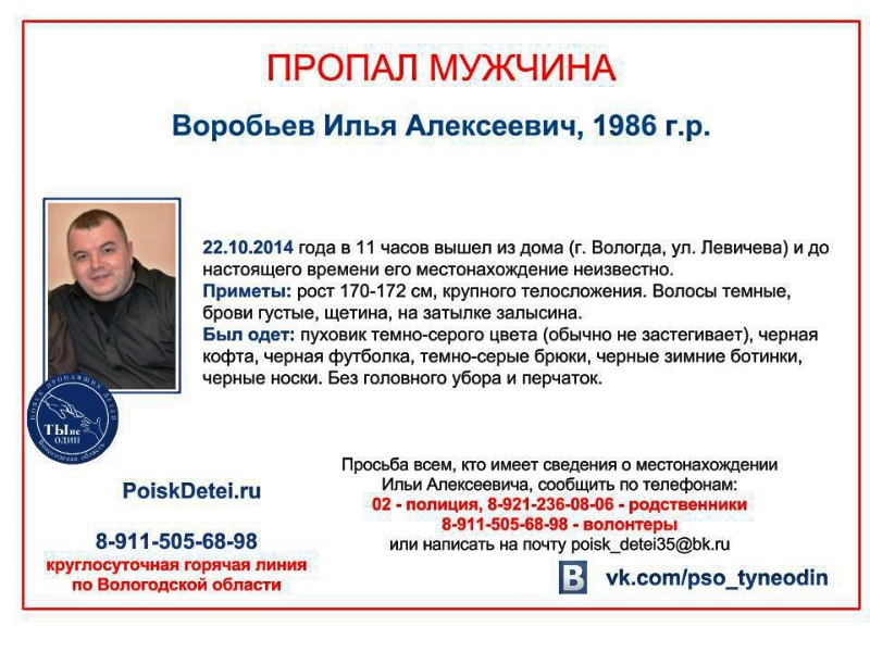 28-летний Илья Воробьев мог отправиться на такси или общественном транспорте в сторону улицы Гагарина или Преображенского. Мужчина ростом 170-172 сантиметра, крупного телосложения. У него темные волосы, густые брови, залысина на затылке. Был одет в темно-серый пуховик, черную кофту, темные брюки, серые ботинки. Илья ушел из дома без головного убора и перчаток, сообщает ИА «СеверИнформ» со ссылкой на группу поискового отряда «Ты не один».