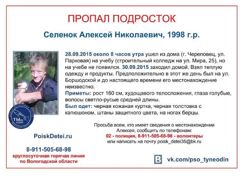 В этот день он должен был быть в строительном колледже, но на занятиях так и не появился. В период поисков очевидцы неоднократно видели его на улицах города, сообщает ИА "СеверИнформ" со ссылкой на поисково-спасательный отряд "Ты не один". Также сообщалось, что ранее Алексей уже уходил из дома.