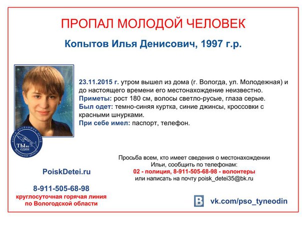 Илья ростом 180 сантиметров, у него светло-русые волосы, серые глаза. Был одет в темно-синюю куртку, синие джинсы, кроссовки с красными шнурками. При себе имел паспорт и телефон, сообщает ИА «СеверИнформ» со ссылкой на ПСО «Ты не один».