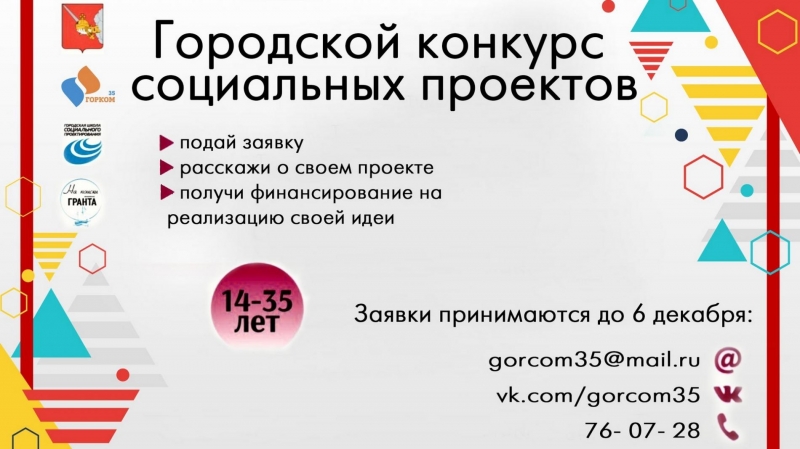 Прием документов на грант проводят до 6 декабря, на Козленкой,2 в молодежном центре «ГОР.COM 35». Так же проект примут и по электронке: gorcom35@mail.ru. Свои вопросы можно задать в сообществе городского волонтерского центра ВКонтакте , а также по номеру городского телефона: 76-07-28, сообщает СеверИнформ.
