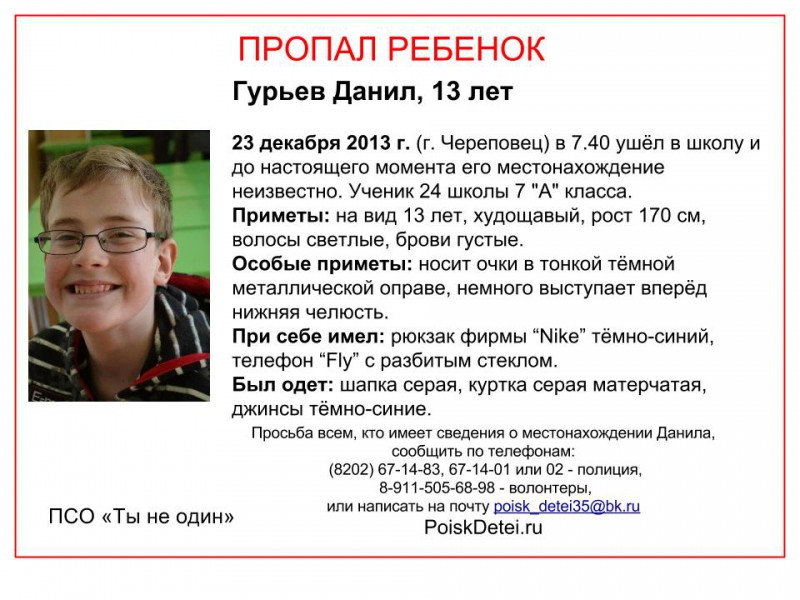 Пропавшего мальчика в Череповце нашли. Он жив и здоров. Напомним, что 13-летний Данил Гурьев ушел в школу и не вернулся 23 декабря. Когда подросток не вернулся домой, родители обратились в полицию. К поискам также подключились волонтеры.