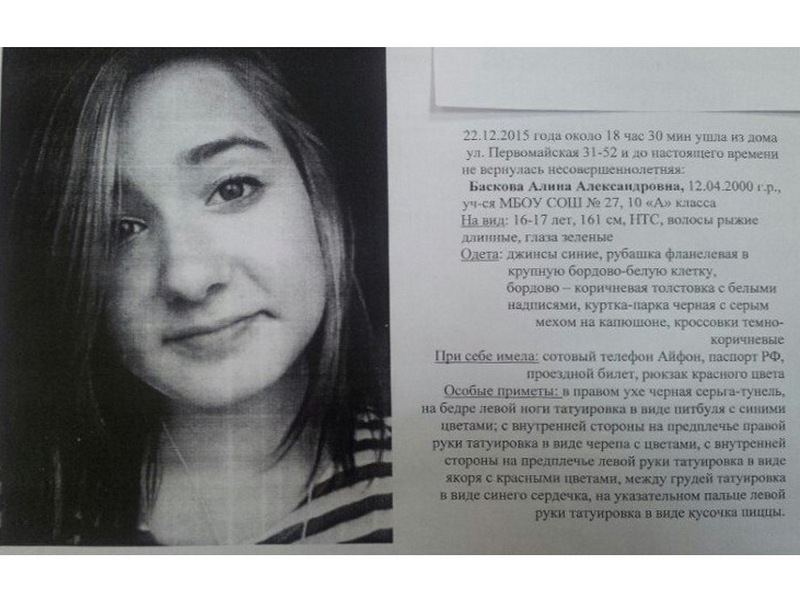 Алине Басковой на вид 16-17 лет, она ростом 161 сантиметр. У нее длинные рыжие волосы и зеленые глаза. Девушка была одета в синие джинсы, рубашку в крупную бордово-белую клетку, бордово-коричневую толстовку с белыми надписями, в черную куртку с серым мехом на капюшоне.