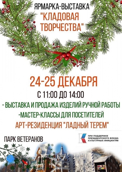Также в оба выходных дня в парке Ветеранов с 11 до 4 часов работает ярмарка-выставка «Кладовая творчества». В арт-резиденции «Ладный терем» представлены игрушки, вязаные изделия, украшения, сладости. В это время проводятся и бесплатные мастер-классы. В субботу педагоги научат делать новогоднюю открытку, в воскресенье — елочную игрушку.