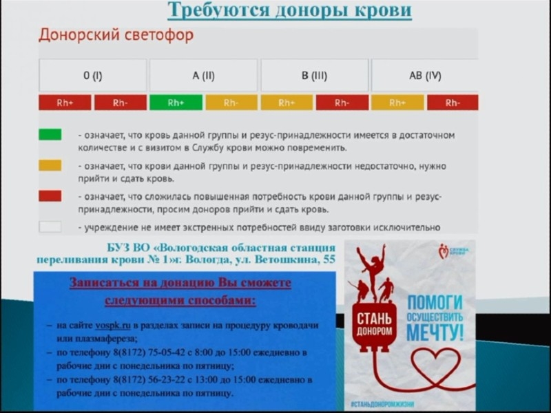 Записаться на процедуру сдачи крови можно по телефонам 75-05-42 с 8 до 15 часов и 56-23-22 с 13 до 15. Станция переливания крови находится в Вологде по адресу Ветошкина, 55, сообщает ИА "СеверИнформ".