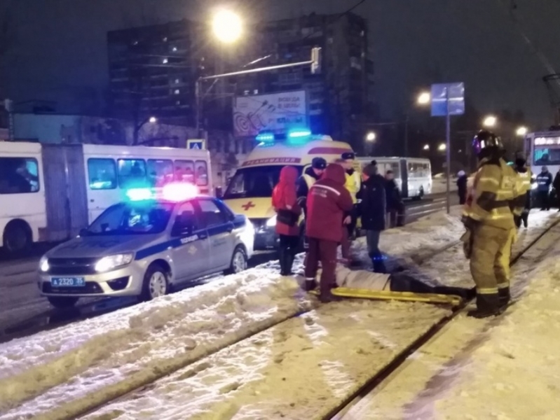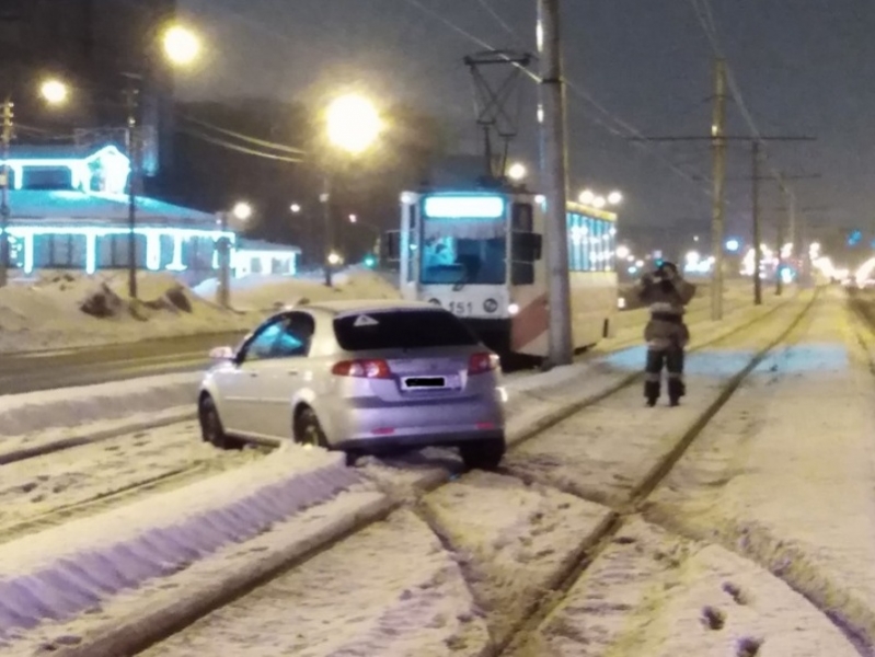 Движение трамваев было остановлено на некоторое время, поскольку пешеход-нарушитель и сбивший его автомобиль оказались на путях.