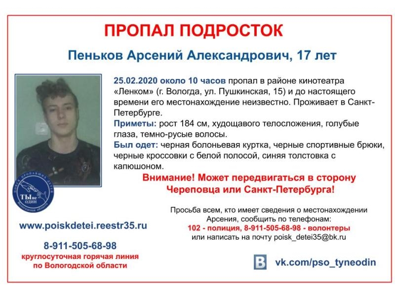 17-летнего Арсения Пенькова разыскивают его близкие, полиция и волонтеры.