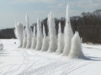 «В зависимости от толщины и структуры льда взрывчатка закладывается двумя способами. В первом случае спасатели бурят сквозную лунку и под лед закладывают взрывчатку. При таком способе работает не только сила самого взрыва, но и энергия воды. Лед ломается за счет ее расширения и последующего гидроудара. Во втором случае лунка бурится не насквозь, тогда в месте закладки взрывчатки спасатели делают гидрозамок. Тогда лед разрушается только силой взрыва. Этот способ применяет в местах, на перекатах и там, где толщина льда не позволяет пробурить лунку насквозь», - цитирует портал Правительства Вологодской области начальника областной аварийно-спасательной службы Алексея Лучинского.