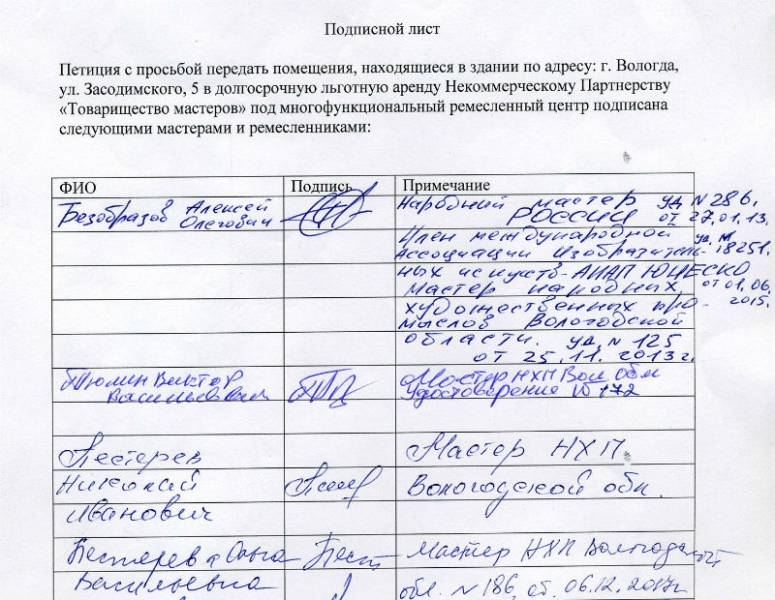«Товарищество мастеров народных промыслов Вологды выдвинуло предложение по содержанию здания, которое за последние семь лет объединило в своих уютных стенах многих творческих, интересных, ярких, самобытных мастеров и ремесленников города Вологды. Все расходы по содержанию здания Товарищество берёт на себя. Учитывая большие проблемы с финансовыми ресурсами городского бюджета, это предложение является очень интересным и, по-настоящему, дружественным в сложившейся ситуации. Товарищество полностью не только сохраняет ту же самую деятельность с мастерами, но продолжает активно развивать тему народных промыслов и ремёсел. Для города, такой наш шаг - существенная помощь в экономии бюджета. С какой стороны не подходи, в предложенном варианте идеальный выход для всех сторон, как говорится в народной мудрости - и овцы целы, и волки сыты. С нетерпением ждём ответа от мэрии города».