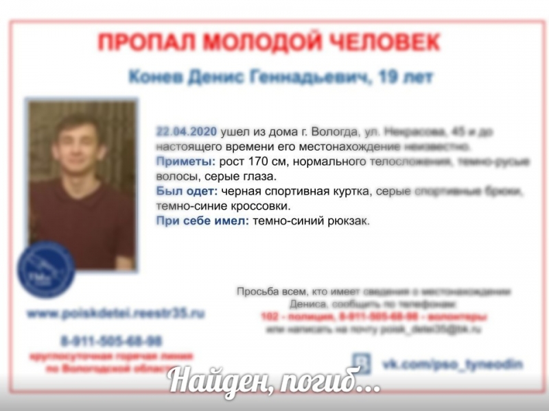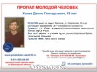 19-летний молодой человек ушел из дома 22 апреля. О местонахождении вологжанина не было сведений.
