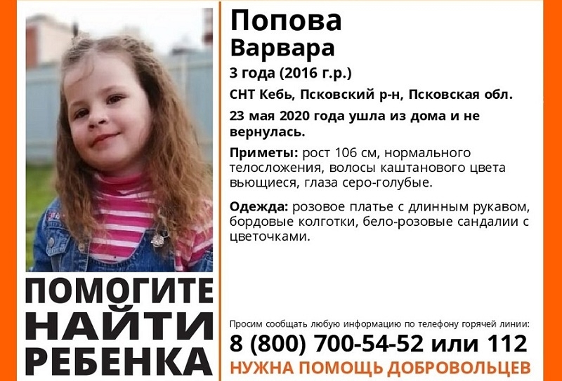 В Псковском районе сотрудники полиции, МЧС, СК, водолазы и добровольцы поисково-спасательного отряда «Лиза Алерт» ведут поиски трехлетней Варвары Поповой. По информации ПСО, девочка 23 мая ушла из дома в садовом товариществе «Кебь» и не вернулась домой.