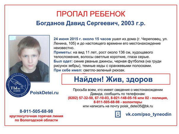 Напомним, 11-летний Давид Богданов ушел из дома днем 24 июня, но обратно не вернулся. Обеспокоенные родственники обратились в полицию. К поискам подключились волонтеры.
