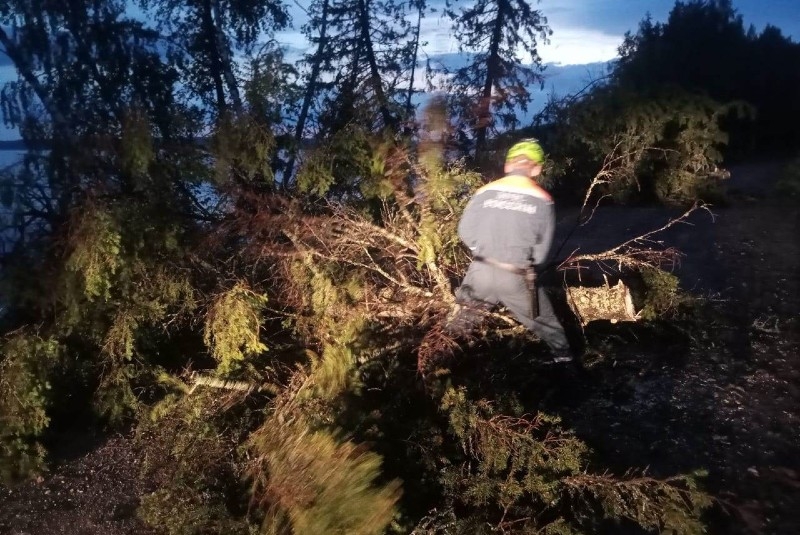 На 258 км трассы Вологда – Медвежьегорск в районе поворота на базу отдыха Берег произошел обвал деревьев. Сильный ветер повалил их прямо на дорогу. По информации поисково-спасательной группы АСУНЦ «Вытегра», повезло, что это произошло уже вечером, когда нет машин.