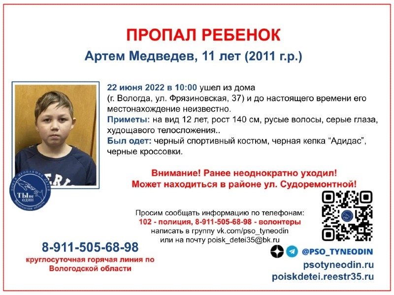 Артем Медведев: на вид 12 лет, рост 140 см, русые волосы, худощавый. Был одет в спортивный костюм, кроссовки и кепку – все черного цвета.