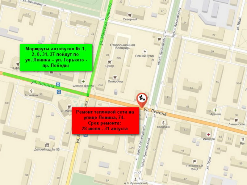 На время проведения ремонтных работ автобусы маршрутов № 1, 2, 8, 31 и 37 будут объезжать ремонт по улице Горького и далее по Победе, сообщает ИА «СеверИнформ». Проезд в прямом направлении по улице Луначарского через Ленина будет открыт в обе стороны.
