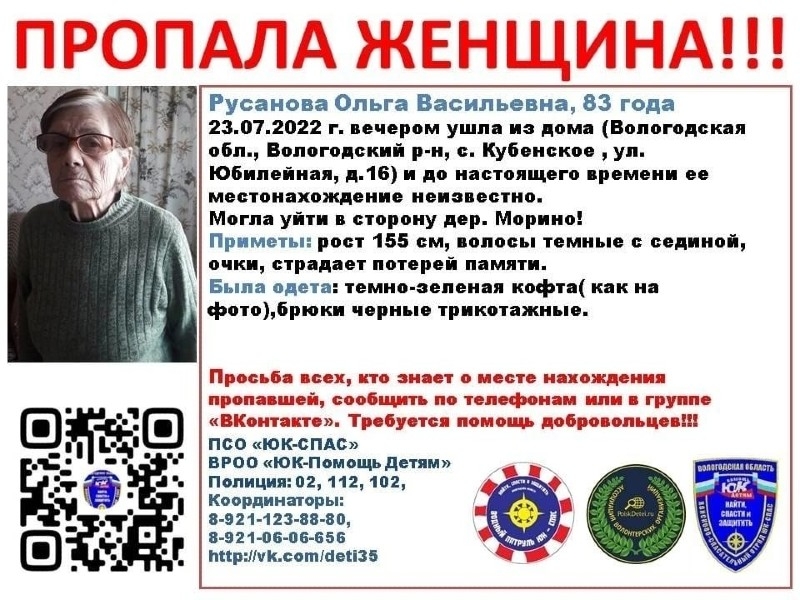 Приметы: рост 155 см, волосы с сединой, носит очки. Была одета в зеленую кофту и черные брюки.