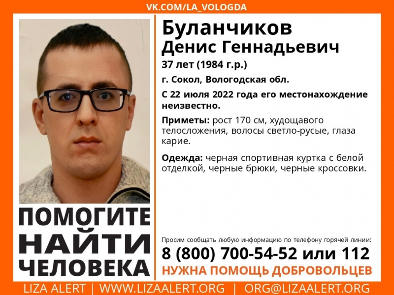 37-летний Денис Буланчиков не выходит на связь с 22 июля. К поискам сокольчанина подключились волонтеры ПСО «Лиза Алерт». Они публикуют ориентировку с приметами пропавшего.