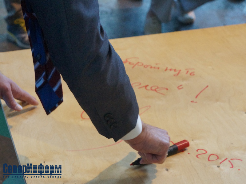 Губернатор оставил автограф на одной из фанерных досок
