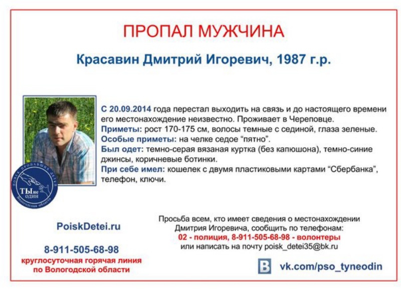 Напомним, 27-летний Дмитрий Красавин пропал в Череповце. Мужчина перестал выходит на связь в субботу, 20 сентября, и до настоящего времени о его местонахождении ничего не было известно. У мужчины осталась жена и маленький ребёнок, сообщает ИА «СеверИнформ».
