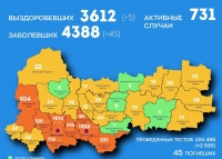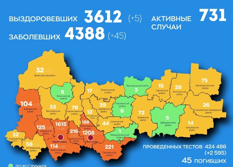 За сутки зафиксировано 45 новых случаев: 19 – Череповец, 11 – Вологда, 6 – Череповецкий район, По 2 в Кадуйском, Шекснинском и Бабаевском районах, по одному случаю в Устюженском, Вытегорском и Вожегодском районах.